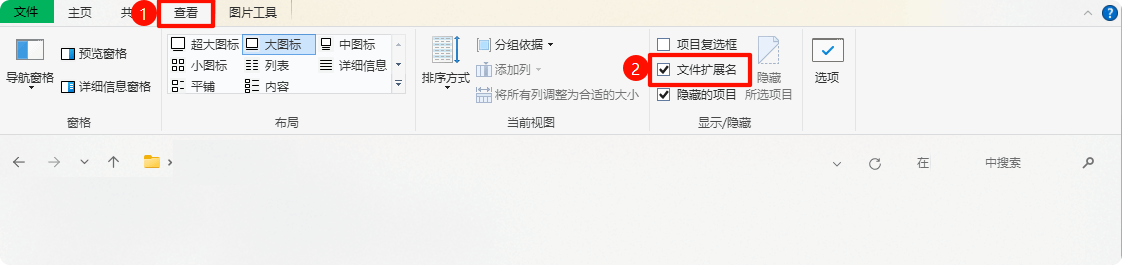 Win + E 打开文件资源管理器 > 查看 > 显示 > 勾选 文件扩展名