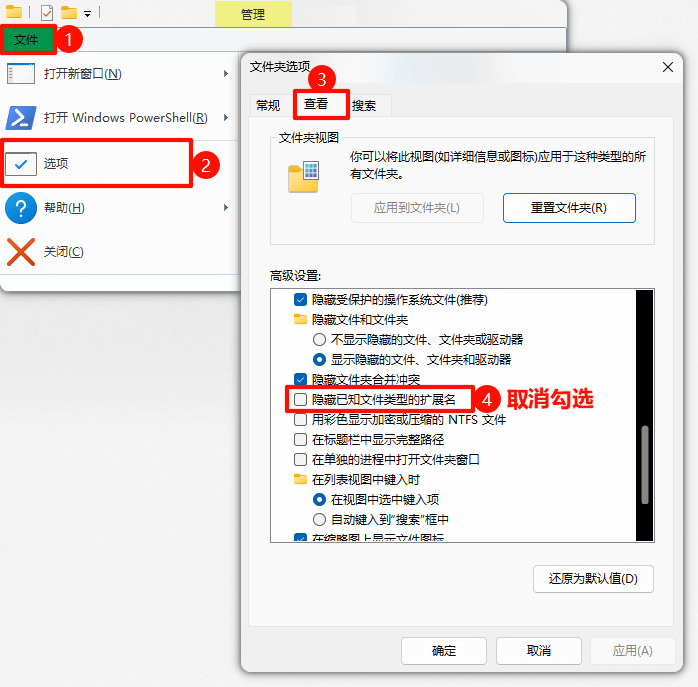 方法二: Win + E 打开文件资源管理器 > 文件 > 选项 > 查看 > 取消勾选 隐藏已知文件类型的扩展名